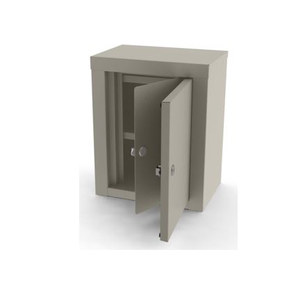 UMF Medical 7781 double door steel narcotic locker. Separate locks on each door, keyed differently. Two adjustable shelves. Comes with a 3 year limited warranty